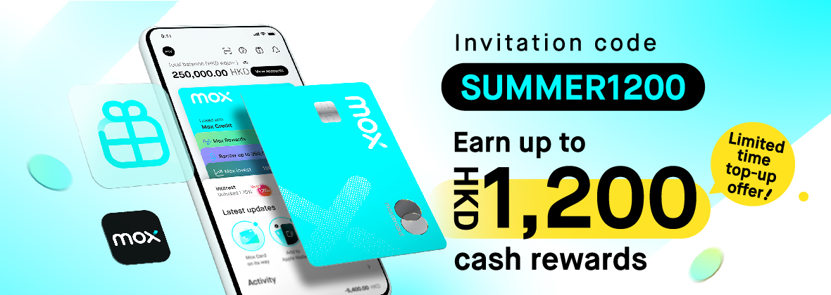 From now until 25 February 2026, open a Mox Account using the invitation code "SAVEINMOX". Complete your account opening within 15 days, make a deposit within 7 days, and maintain HKD100,000 or more in your HKD savings account until the end of the Hold Fund Period to earn HKD1,000 cash rewards -- equivalent to a total savings rate of around 6% p.a.! Start saving smarter. Join Mox today¹!