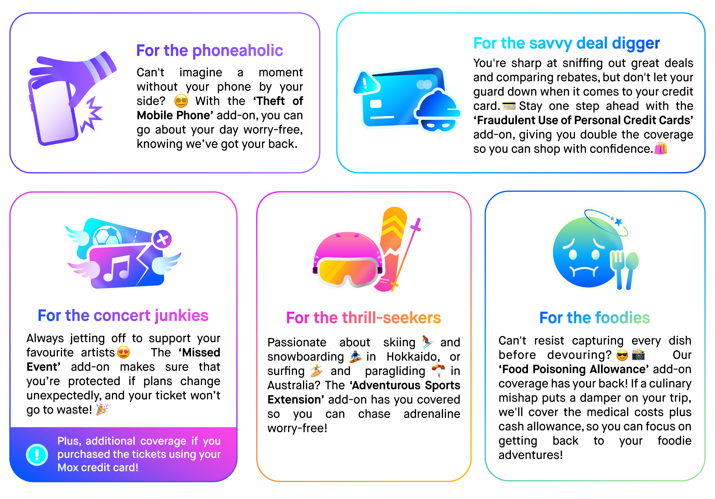 Learn moreGet instant protection with a few taps on your Mox app. It's so easy, you can literally buy it right away - even as you’re heading to the airport. Just buy and go!