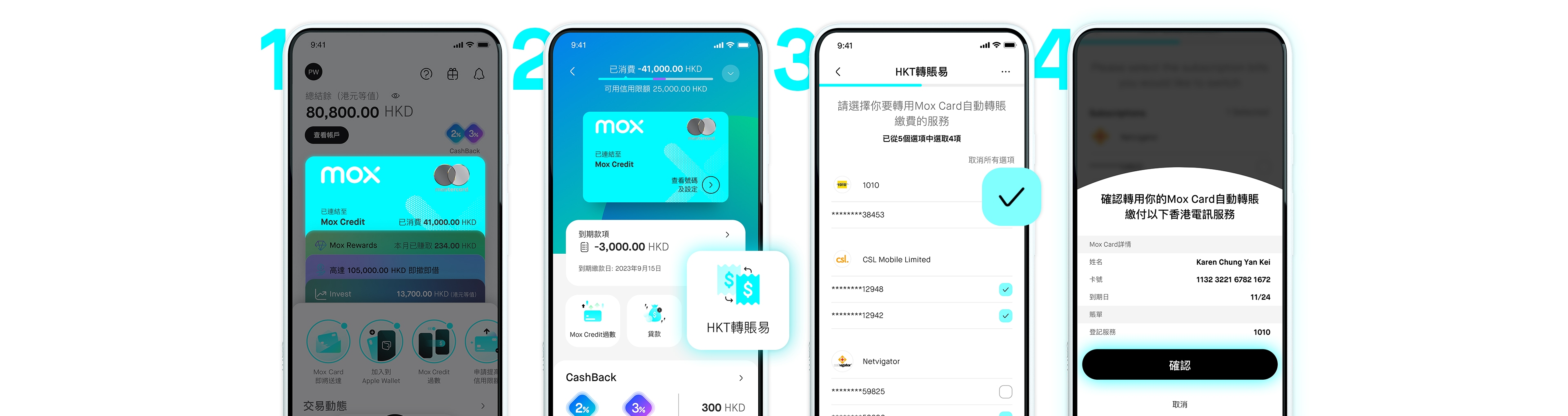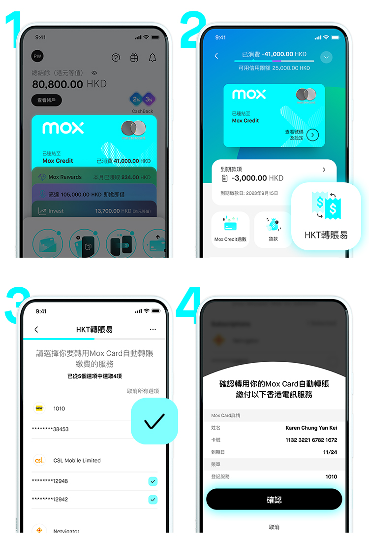 轉用Mox信用卡繳付HKT 香港電訊賬單非常簡單,只需幾秒: