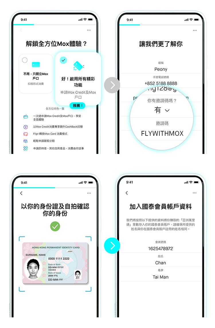 優惠期內,新客戶用「FLYWITHMOX」開戶並在其後30日內成功申請Mox信用卡,即可免除HKD250,000存款要求,率先體驗最高基本獎賞!如你選擇「亞洲萬里通」里數為Mox信用卡消費獎賞,任何信用卡簽賬均冇上限狂賺HKD4=1里的超值兌換率,限時60日(於Mox信用卡批核成功當天起計)!里數賞獎更會於每筆交易結算後直接存入你嘅「國泰會員賬戶」,賺里真正零等待!